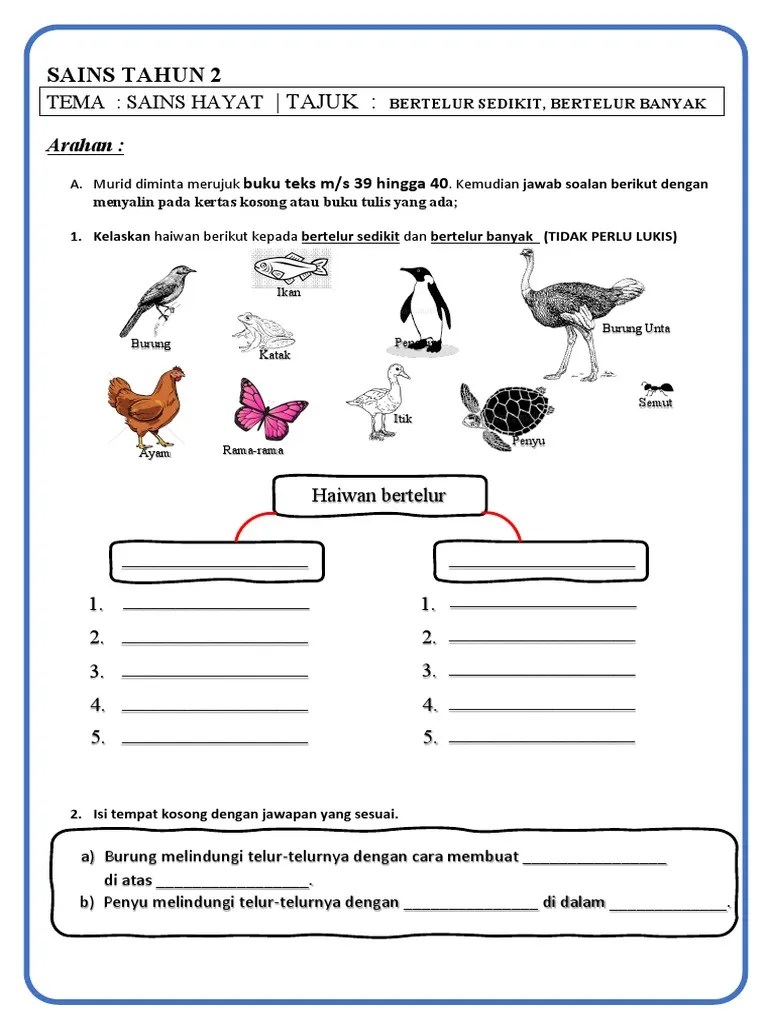 Myguru merupakan portal pembelajaran yang dibina selaras dengan keperluan silibus pelajar tahun 1 hingga tingkatan 5. Bertelur banyak dan sedikit 1 (tahun 2). Apakah contoh haiwan bertelur sedikit? Explain with examples animals that lay many eggs and . Apakah contoh haiwan bertelur sedikit? Ciri pada haiwan yang bertelur banyak ialah. Haiwan yang bertelur ada yang bertelur sedikit dan ada bertelur banyak. ٢٠ ذو الحجة ١٤٤٠ هـ. Add to my workbooks (6) Play this game to review science. Bertelur sedikit dan bertelur banyak #cikgootube #cikguzoul. Bertelur sedikit dan bertelur banyak #cikgootube #cikguzoul · chapter : Haiwan (bertelur dan beranak banyak atau sedikit)buku teks :